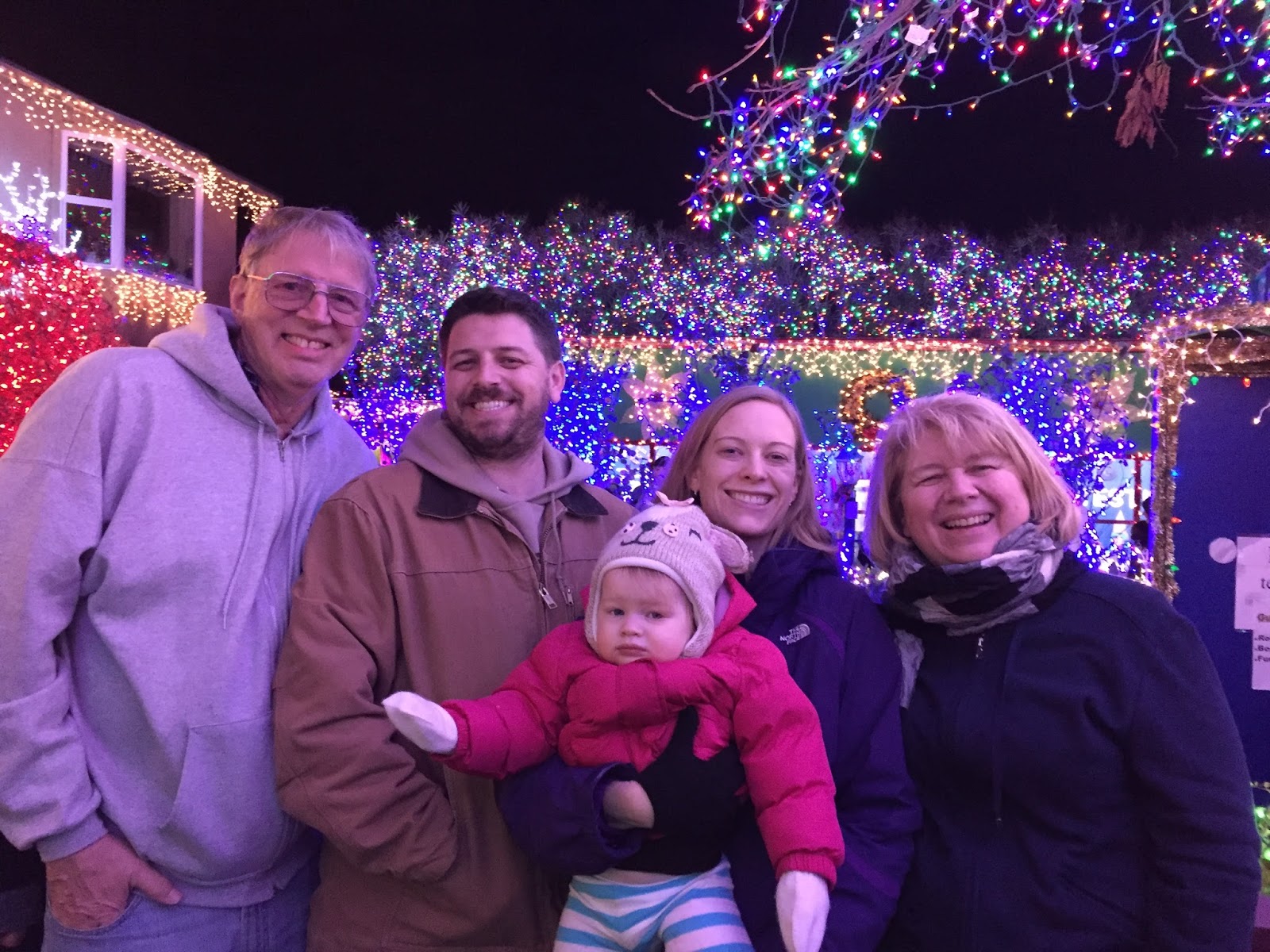 After our meal, Dan and Carrie took Vivian to the restroom while I proceeded out to the lobby. I spent all the time they were busy with Vivian trying to figure out how to open the stroller. I saved face by succeeded just before they rounded the corner. On our way exiting, I took a photo of Dan with Vivian by the restaurant's beautiful Christmas tree.
