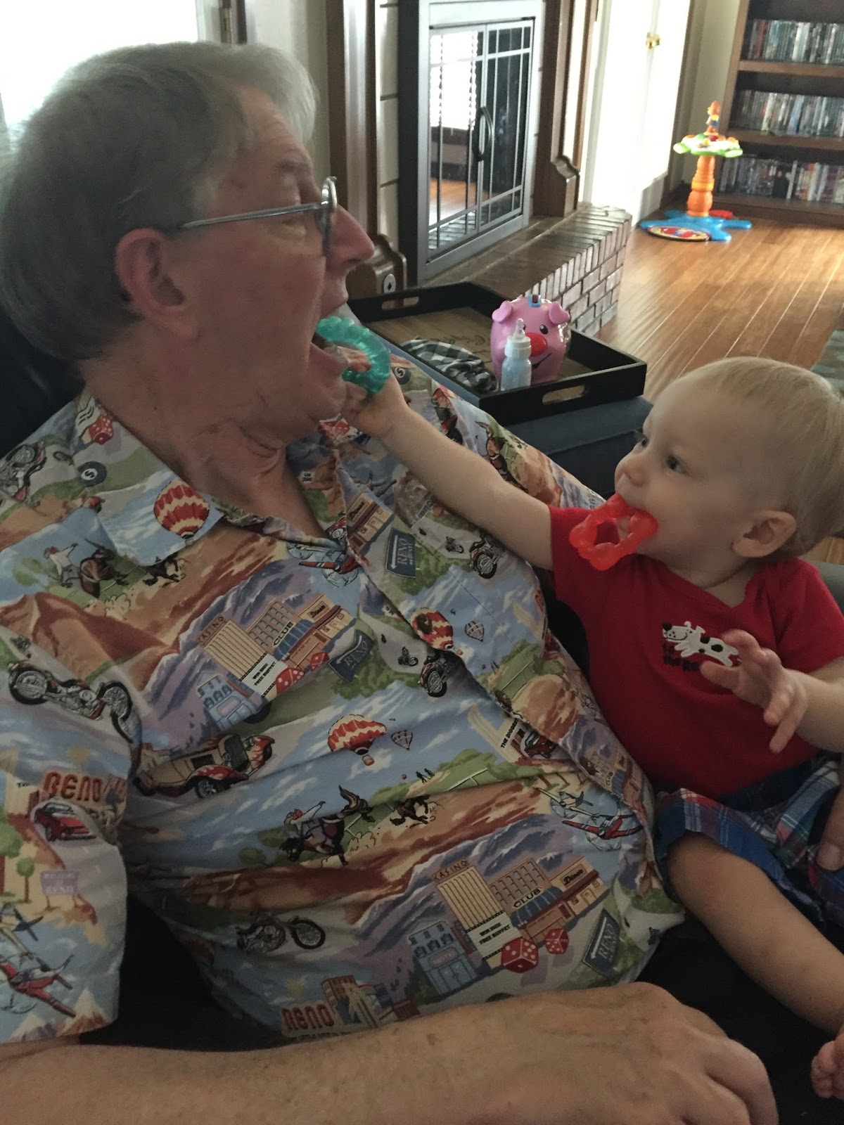 We got dressed and had a small, quick breakfast. Looks like Isaiah thought he should share his with Grandpa. It sorta looks like a donut...