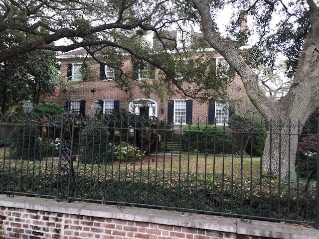 As we continued on southward we crossed Broad street. We were told what special meaning the phrase "South of Broad" had. It is kind of like the opposite of the wrong side of the tracks. South of road is the where one find the homes of the wealthy. We were alerted to take note of the super sculpted fancy gardens behind the wrought iron fences.