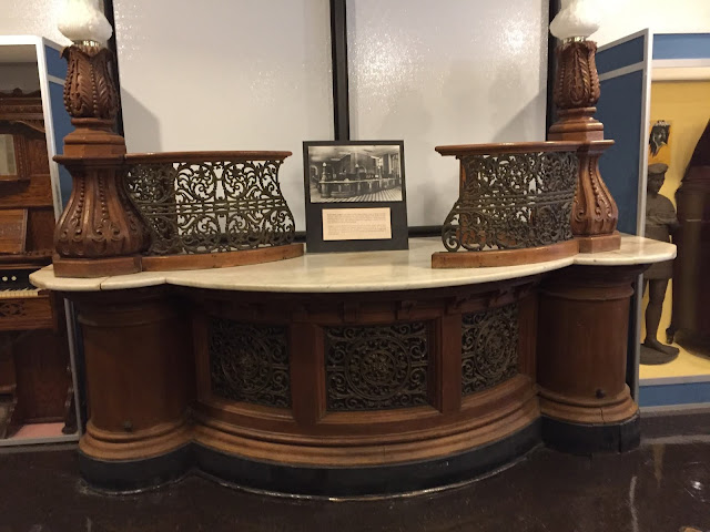 I took a picture of this circa 1900 flute formerly owned by a member of the 4th Brigade Band in Charleston because I too play the flute, although not in the previous century. Per the information card in the case a celebratory ribbon of 13 stars and an eagle is at the base of the blonde wood portion of the flute. It is faint but the image can still be made out.