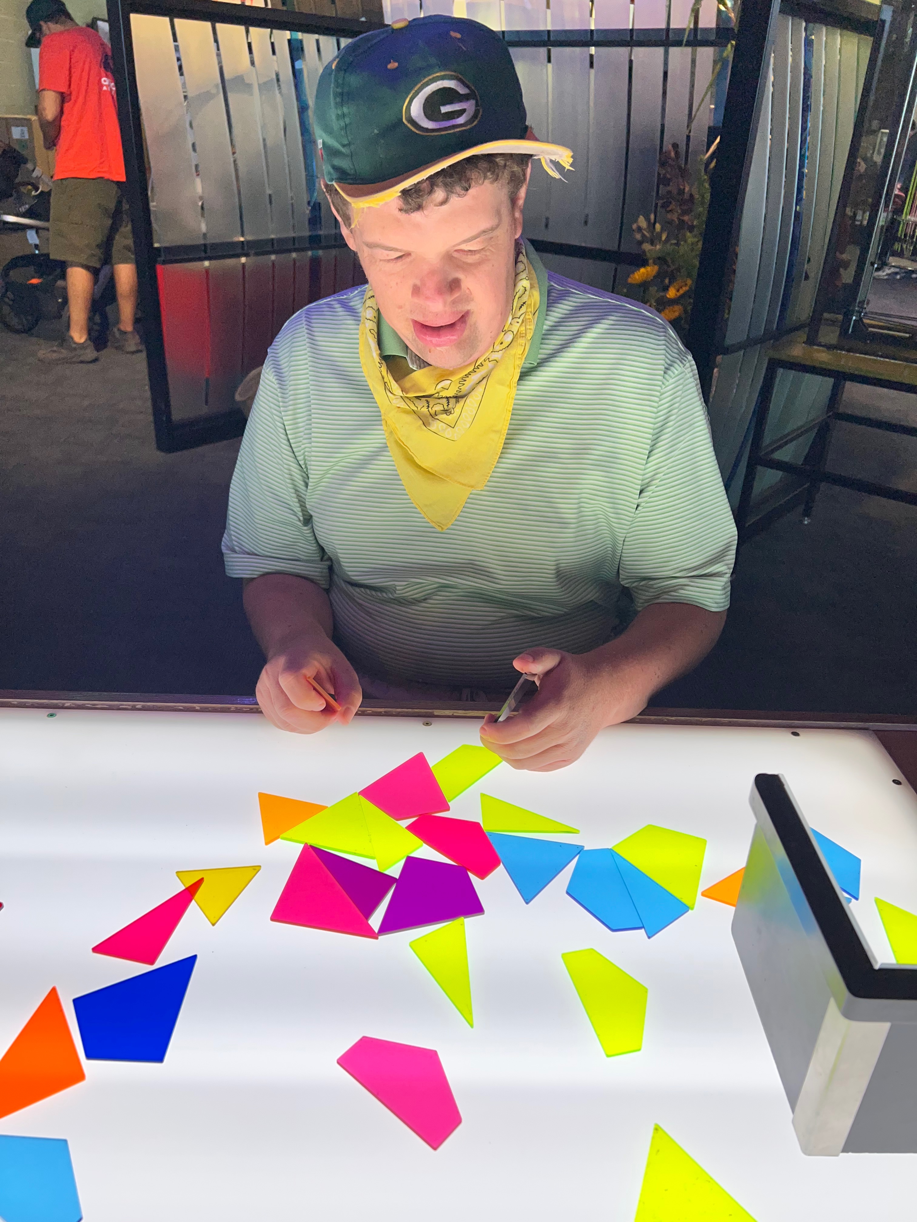 Alex liked manipulating the translucent shapes on a light table. He spent a fair amount of time there enjoying the colors and moving polygons around. Frank played with the nearby cascade display/demonstration.